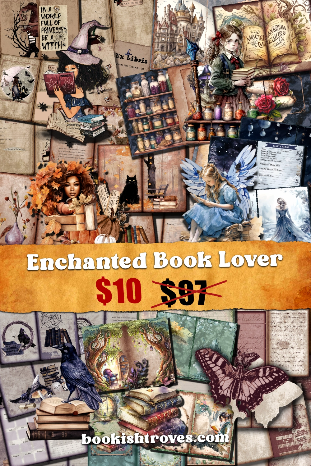 Bewitched Bookworm is a vintage aesthetic collection of junk journal pages and ephemera featuring witches, magic brooms, spooky pumpkins, cauldrons and books.