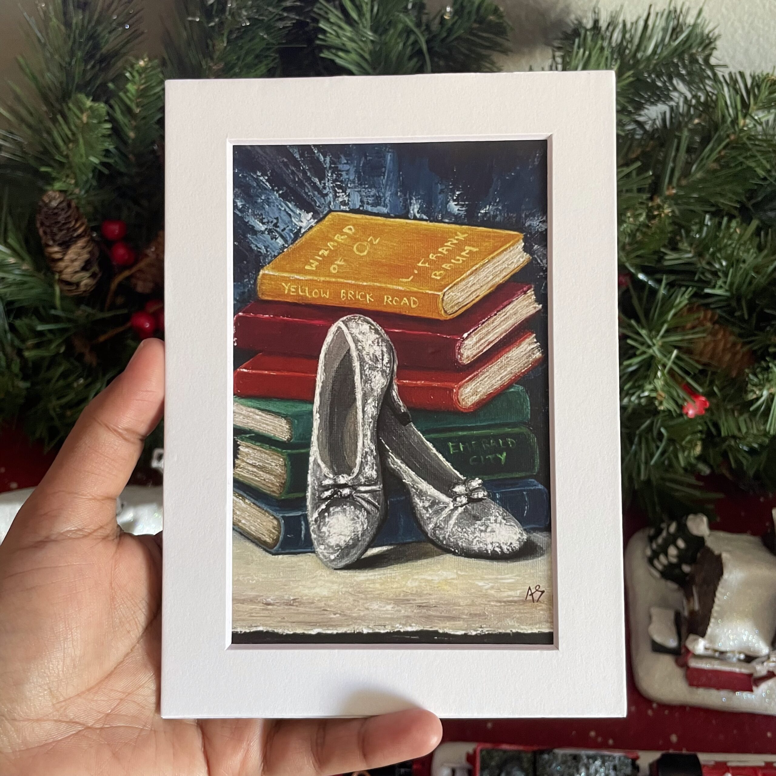 Print of an original handmade painting by Ash Stral. This artwork is inspired by the beloved children’s classic: The Wonderful Wizard of Oz books. Even though Dorothy’s magic slippers are silver in the book, they were designed to be red in the Technicolor movie to show up more vividly against the yellow brick road and are one of the most iconic items.
